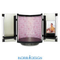 簡単に交換できる飾り板 購入時に仏壇の色がお部屋のインテリアに調和する色合いでも、仏壇を違うお部屋に置きたくなったり、引っ越ししてインテリアの色合いが異なってしまう場合もあります。 小さなデザイン仏壇の飾り板は、お客様でも交換できるように配慮されています。飾り板は透明の板の背後に薄いシートを挟み込んでありますので、別途シートのみをお買い求めいただければ、簡単に違うお色の飾り板になります。 また、想い出の場所の写真などを飾り板に使用することもできますので、オリジナルの飾り板を簡単に作ることができます。A3写真用紙サイズの上部4cmを切り取っていだだくと、飾り板にぴったり納まるサイズ(257x420mm)になります。※A3写真用紙と印刷できるプリンタが別途必要です。 |